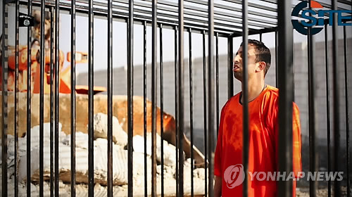 | △ IS, 요르단 조종사 살해 (AP/시테 인텔리전스 그룹=연합뉴스) 수니파 원리주의 무장단체 '이슬람국가'(IS)는 지난해 12월 생포한 요르단 조종사 마즈 알카사스베(26) 중위를 살해하는 영상을 3일(현지시간) 공개했다. 22분짜리 이 영상은 오렌지색 죄수복을 입은 마즈 중위가 야외에 설치된 철창에 갇힌 채 불길에 휩싸여 사망하는 장면을 보여줬다. 사진은 테러·극단주의 감시단체 '시테'(SITE) 사이트에 실린 이날 영상에서 캡처한 마즈의 모습. |