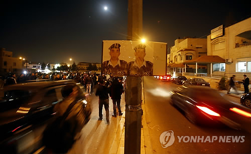 | △ (AP=연합뉴스) 수니파 원리주의 무장단체 이슬람국가(IS)가 3일(현지시간) 요르단 조종사 마즈 알카사스베(26) 중위를 불태워 살해하는 영상을 공개한 가운데 수도 암만의 마즈 소속 부족의 집회소 근처에 그의 피살을 애도하고 규탄하는 시민들이 모여들고 있다. 압둘라 2세 요르단 국왕이 마즈 중위의 피살을 규탄하고 당국이 응징을 공언하고 나선 가운데 시민들도 거리로 뛰쳐나와 조종사의 희생을 애도하고 복수를 다짐했다. |