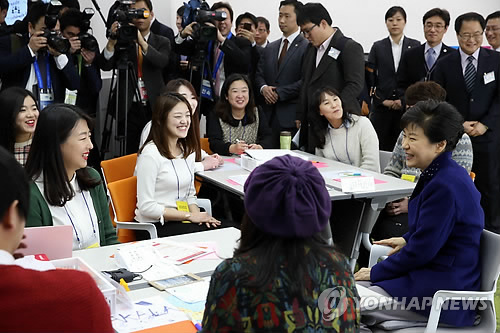 | △ 충북창조경제센터 둘러보는 박 대통령 (청주=연합뉴스) 도광환 기자 = 박근혜 대통령이 4일 오전 충북 청주시 오송읍 충북지식산업진흥원에서 열린 충북창조경제혁신센터 출범식에서 마케팅 기획 실습실을 방문해 참석자들과 이야기를 나누고 있다. 2015.2.4 dohh@yna.co.kr |