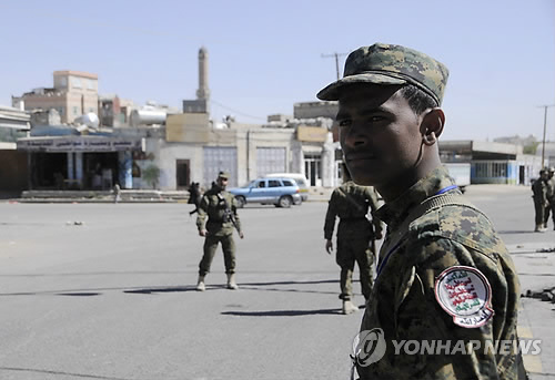 | △ 경찰 제복을 입은 예멘의 시아파 반군 후티 대원이 1일(현지시간) 수도 사나에서 경비를 서고 있다. (EPA=연합뉴스) |
