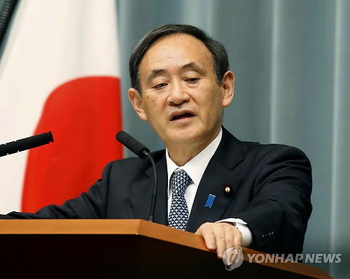 | △ (AP/교도통신=연합뉴스.자료사진) 스가 관방장관 |