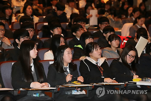 | △ 특성화고 취업진로 페스티벌 (서울=연합뉴스) 박지호 기자 = 5일 오후 서울 삼성동 코엑스에서 한국무역협회 주최로 열린 '2015 특성화고 취업진로 페스티벌'에 참가한 학생들이 취업특강을 듣고 있다. 2015.2.5 jihopark@yna.co.kr |