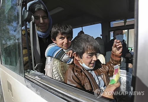 | △ 극단주의 무장단체 '이슬람국가'(IS)에 붙잡혀있다 풀려난 소수민족 야지디족 형제가 지난 18일(현지시간) 이라크 키르쿠크 외곽 알툰 쿠프리에서 버스에 먼저 올라 어머니가 탑승하기를 기다리고 있다. (AP=연합뉴스) |