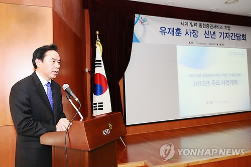 (서울=연합뉴스) 윤선희 기자 = 유재훈 한국예탁결제원 사장은 5일 "민간 경영에 대비해 다각화와 국제화에 나서 시장성 있는 세계 일류 종합증권서비스 기업으로 도약하는 계기를 마련하겠다"고 말했다.