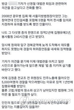| △ 윤교사 페이스북 글 표현 놓고 교육계 논란 (서울=연합뉴스) 서울시교육청이 최근 특별채용한 전국교직원노동조합 출신 해직교사 윤모씨에 대해 교육부가 임용이 적절했는지 본격적인 검토에 나섰다. 교육부 관계자는 5일 "윤 교사가 특별한 대우를 받을 만한 정당한 사유가 있는지 면밀히 검토할 것"이라며 "서울교육청에서 받은 소명자료와 윤 교사의 소셜네트워킹서비스(SNS) 발언까지 살펴볼 것"이라고 말했다. 윤 교사는 페이스북에서 "법원에 그리 미련 둘 필요가 있을까 싶다. 인민의 힘으로 인민재판정을 만드는 게 민주공화국을 앞당기는 지름길이지 않을까?"라고 적었다. <<윤교사 페이스북>> zjin@yna.co.kr |
