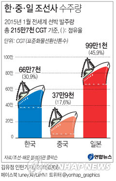 (서울=연합뉴스) 정주호 기자 = 일본 조선사들이 한국과 중국을 나란히 제치고 지난달 수주실적에서 세계 1위에 올랐다.