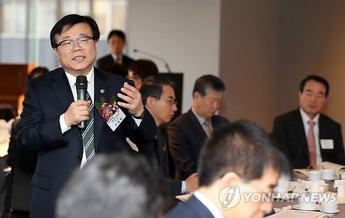 | △ 식품업계 간담회 참석한 이동필 장관 (서울=연합뉴스) 신준희 기자 = 이동필 농림축산식품부 장관이 6일 오전 서울 플라자호텔에서 열린 식품업계 CEO들과의 간담회에 참석, 업계 관계자의 질문에 답하고 있다. 2015.2.6 hama@yna.co.kr |