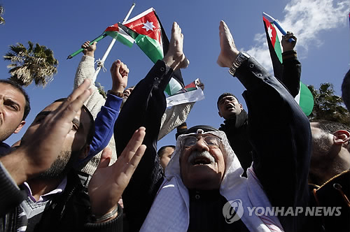 | △ 요르단의 분노 (AP=연합뉴스) 요르단 시민들이 4일(현지시간) 미국 방문 일정을 단축하고 귀국하는 압둘라 국왕을 맞이하기 위해 암만의 퀸 알리아 공항에 모인 자리에서 요르단 공군 조종사를 살해한 이슬람국가(IS)에 강경하게 대처한 정부를 지지하는 구호를 외치고 있다. |