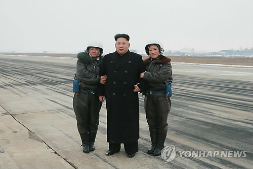 | △ 조종사와 기념촬영하는 김정은 (평양 조선중앙통신=연합뉴스) 김정은 북한 국방위원회 제1위원장이 추격기·폭격기 부대의 비행 전투 훈련을 지도했다고 조선중앙통신이 24일 보도했다. 중앙통신은 이날 "최고사령관 김정은 동지의 직접적 발기에 따라 조선인민군 항공 및 반항공군(공군) 근위 제1항공 및 반항공사단관하 추격기·폭격기 연대의 비행전투훈련이 진행됐다"고 밝혔다. 2015.1.24 photo@yna.co.kr |