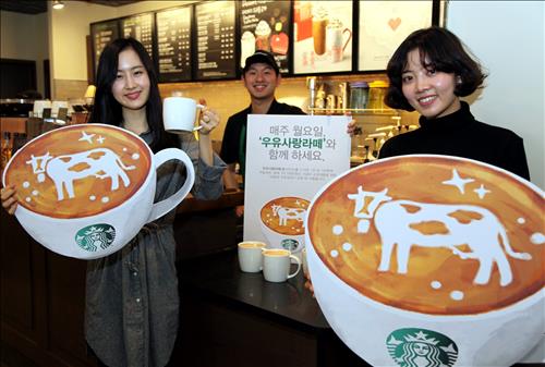 스타벅스커피 코리아가 한국낙농육우협회와 펼치는 이번 '우유사랑 라떼' 캠페인은 원유 공급 과잉 문제로 어려움을 겪는 낙농가를 돕고 국산 우유 소비를 촉진하기 위한 것이다.