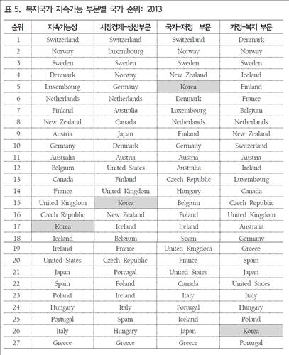 8일 보건사회연구 최근호에 게재된 석재은 한림대(사회복지학) 교수의 'OECD 복지국가 지속가능성의 다차원적 평가와 지속가능 유형별 복지정책의 특성' 보고서에 따르면 2013년 재정, 경제, 사회 영역의 10개 지표를 통해 OECD 27개 국가의 '복지국가 지속가능 지수'를 산출한 결과 한국은 17위에 올랐다.