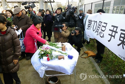 | △ (후쿠오카 교도=연합뉴스) 8일 일본 후쿠오카(福岡)시 후쿠오카 구치소 앞에서 열린 윤동주 서거 70주년 추도행사에서 참가자가 헌화하고 있다. |