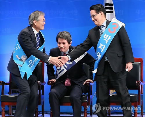 | △ 악수하는 문재인 박지원 (서울=연합뉴스) 진성철 기자 = 새정치민주연합 새 당대표에 선출된 문재인 의원(왼쪽)이 8일 서울 송파구 올림픽체조경기장에서 열린 새정치민주연합 제1차 정기전국대의원대회에서 고배를 마신 박지원 의원과 악수하고 있다. 2015.2.8 zjin@yna.co.kr |
