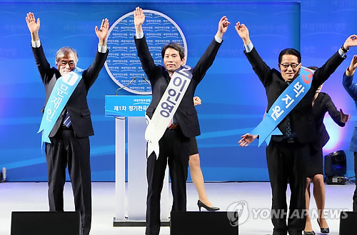 | △ 인사하는 당 대표 후보자들 (서울=연합뉴스) 진성철 기자 = 문재인(왼쪽 부터), 이인영, 박지원 당대표 후보가 8일 서울 송파구 올림픽체조경기장에서 열린 새정치민주연합 제1차 정기전국대의원대회에서 손을 들어 인사하고 있다. 2015.2.8 zjin@yna.co.kr |