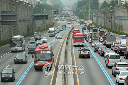 | △ 반포IC 인근에서 판교IC방향으로 바라본 경부고속도로. 확 뚫린 버스전용차로로 버스가 달려가는 반면 일반차량들은 꽉 막혀 정체를 빚고 있다. (연합뉴스 자료사진) |
