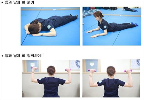 등 건강을 위해서는 장기적으로 등 근육 운동을 많이 하는 게 좋다. 바닥에 엎드린 상태에서 팔꿈치를 펴고 땅을 밀어주는 느낌으로 고개와 등을 들어 올리는 '등과 날개 뼈 펴기', 앉아서 아령을 들고 팔을 90도로 세운 후 등 뒤로 팔을 꺾어 날개 뼈를 최대한 모으는 '등과 날개 뼈 강화 운동' 등이 꼿꼿하게 목을 유지할 수 있는 운동으로 추천된다.