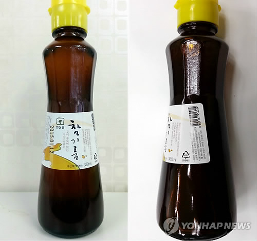 | △ 벤조피렌 기준 초과 검출 참기름 회수 조치 (서울=연합뉴스) 식품의약품안전처는 식품제조·가공업체 농업회사법인살림농산주식회사가 제조한 '한살림참기름' 2개 제품에서 벤조피렌이 기준 초과 검출돼 판매중단 및 회수 조치한다고 9일 밝혔다. 회수 대상 제품은 각각 제조일자가 2014년 12월 15일, 2015년 1월 12일인 제품이다. (식약처 제공) |