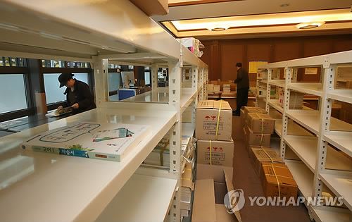 | △ 초·중·고교 교과서 가격을 둘러싸고 교육부와 교과서 출판사들 간 대립으로 시중 서점에 교과서 공급이 중단된 가운데 지난해 3월 오후 서울 종로구 교보문고 교과서 매장의 책장이 텅 비어 있다. (연합뉴스 자료사진) |