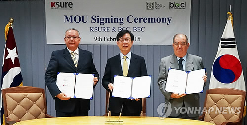 (서울=연합뉴스) 이웅 기자 = 한국무역보험공사가 9일(현지시간) 쿠바 수도 아바나에서 쿠바중앙은행(BCC), 쿠바대외은행(BEC)과 '한국기업의 대(對)쿠바 수출지원을 위한 무역보험 신용공여 양해각서(MOU)'를 체결했다고 10일 밝혔다.