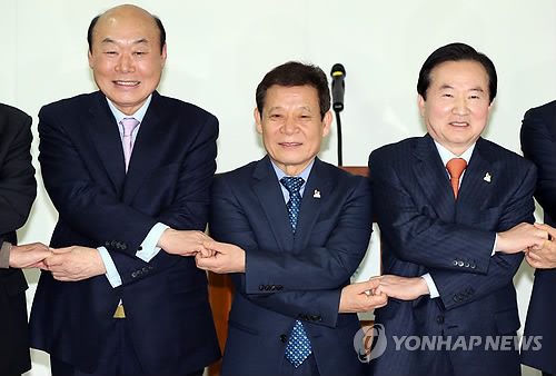 | △ 손 맞잡은 광주 전·현직 시장 (광주=연합뉴스) 박철홍 기자 = 윤장현 광주시장(가운데)이 10일 오후 광주 동구 U대회 조직위원회에서 박광태·강운태 전 광주시장에게 명예위원장 위촉장을 수여하고 기념촬영하고 있다. 2015.2.10 pch80@yna.co.kr |