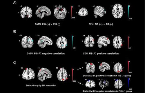| △ A) 아밀로이드 침착 군과 비 침착 군 사이 뇌 기능 신경망의 연결성 차이 DMN 기능 연결성이 침착 군에서 증가되었으며, CEN 연결성은 감소 되어있다. B) 아밀로이드 침착 군 에서 아밀로이드 침착 정도와 기능 신경망 사이의 관계: DMN 기능연결성과 음의 상관관계, CEN과 양의 상관관계가 있음. C) 아밀로이드 침착 군에서 DMN과 피험자의 삽화기억의 상호작용의 모습 |