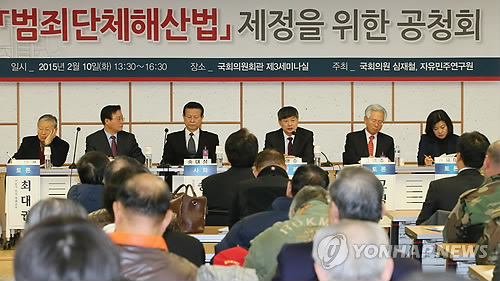 | △ 범죄단체해산법 제정 공청회 (서울=연합뉴스) 진성철 기자 = 10일 국회 의원회관에서 새누리당 심재철 의원, 자유민주연구원 주최로 '범죄단체해산법 제정을 위한 공청회'가 열리고 있다. |