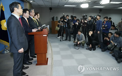 | △ 총리후보자 언론회유 의혹 관련 기자회견 (서울=연합뉴스) 이상학 기자 = 국무총리 후보자 인사청문특위 새정치민주연합 유성엽 간사와 위원들이 10일 국회 정론관에서 이완구 총리 후보자의 언론회유 의혹 관련 기자회견을 하고 있다. |