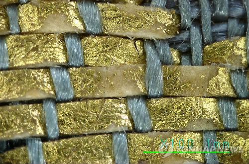 | △ 금사(金絲)로 제작한 고려시대 직물 (부여=연합뉴스) 보물 1572호 서산 문수사 금동아미타불상(1346) 복장 직물인 고려시대 남색 원앙문 직금 능(藍色鴛鴦紋織金綾)의 세부. 수덕사 근역성보관 소장. 금실로 제작한 이 유물을 최근 전통문화대학교가 복원했다. 2015.2.11 << 전통문화대학교 제공 >> taeshik@yna.co.kr |