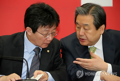 | △ 새누리 지도부 대화 (서울=연합뉴스) 백승렬 기자 = 새누리당 김무성 대표(오른쪽)와 유승민 원내대표가 11일 국회에서 열린 최고·중진연석회의에서 대화하고 있다. |