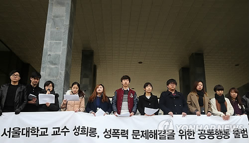 | △ '교수 성추행 문제' 공동대응 나선 서울대생들 (서울=연합뉴스) 이지은 기자 = 서울대학교 학부와 대학원 학생들이 11일 오전 서울 관악캠퍼스 행정관 앞에서 교수들의 잇따른 여학생 성추행 문제에 대응하기 위해 '서울대 교수 성희롱, 성폭력 문제해결을 위한 공동행동'을 출범하며 기자회견을 열고 있다. |
