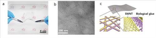 | △ 단일벽탄소나노튜브(SWNT)와 바이오물질을 이용해 만든 투명한 전도성 나노그물(a)과 나노그물 미세구조 사진 및 설명 그림(b,c). 생체접착제 기능을 하는 바이오 물질은 나노그물의 나노구조를 제어할 뿐 아니라 대면적 나노그물구조를 유지하고 안정화하는 역할도 한다. |
