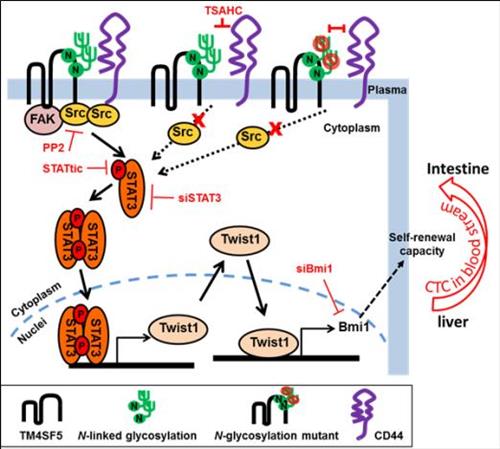 그 결과 TM4SF5와 CD44가 모두 있는 세포로부터 형성된 암덩어리에서 이탈한 암세포들은 6주 후에도 혈액 속에 살아남아 다른 장기로 전이되고 소수 세포라도 자가 재생을 통해 전이암을 일으키는 것으로 동물실험에서 확인됐다.