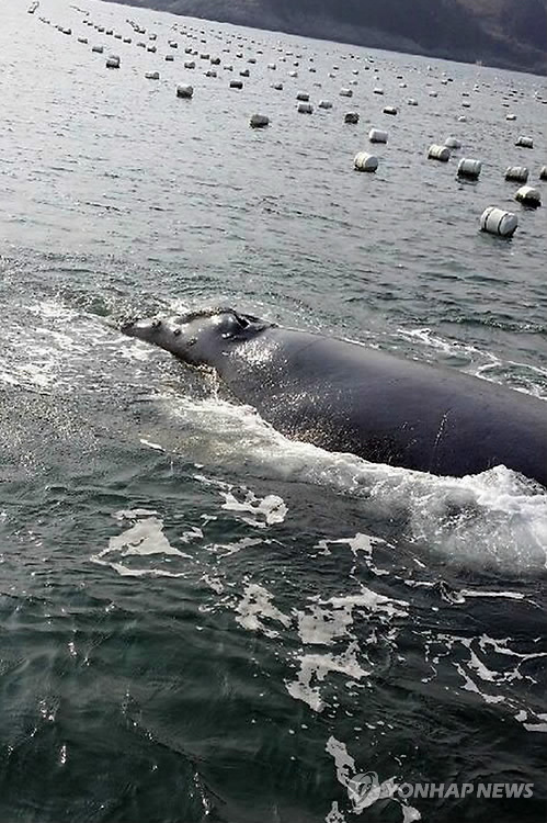 | △ 그물에 걸린 멸종위기 긴수염고래 (부산=연합뉴스) 멸종위기종인 긴수염고래가 11일 오전 남해에 있는 양식장 줄에 걸려 있다. 북태평양 긴수염고래(Right whale)가 우리나라에서 발견된 것은 41년 만의 일이다. 2015.2.11 << 통영해양경비안전서 >> osh9981@yna.co.kr |