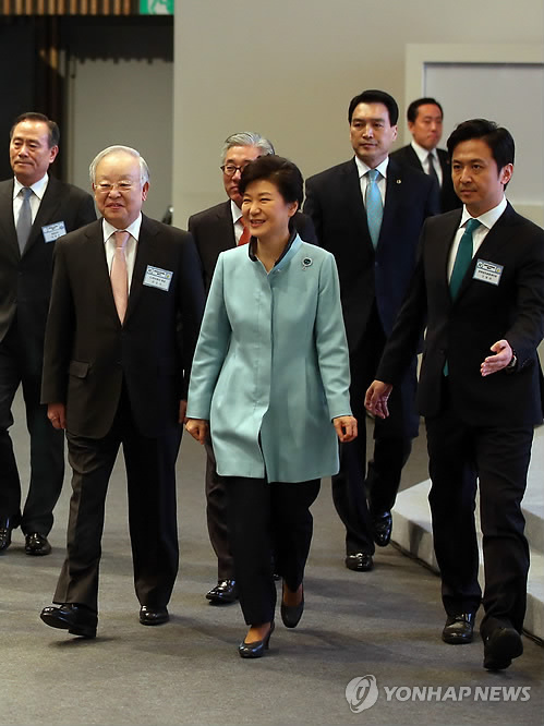 | △ 문화창조융합벨트 출범식 (서울=연합뉴스) 도광환 기자 = 박근혜 대통령이 11일 오전 서울 마포구 상암동 CJ E&M센터에서 열린 문화창조융합벨트 출범식에서 손경식 CJ 회장 등과 함께 행사장에 입장하고 있다. |
