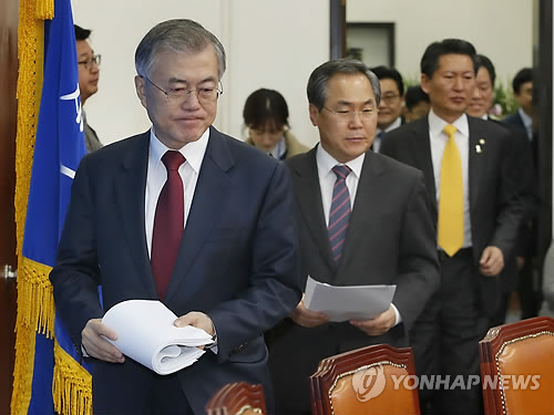 | △ 최고위원회의 참석하는 지도부 (서울=연합뉴스) 이상학 기자 = 새정치민주연합 문재인 대표와 우윤근 원내대표가 11일 오전 국회에서 열린 최고위원회의에 참석하고 있다. |