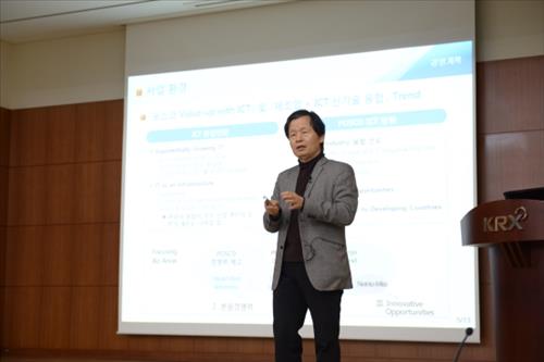 | △ 포스코ICT 최두환사장이 지난 10일 여의도 한국거래소에서 열린 자사의 기업설명회에서 올해 사업계획에 대해 투자자들에게 설명하고 있다. |