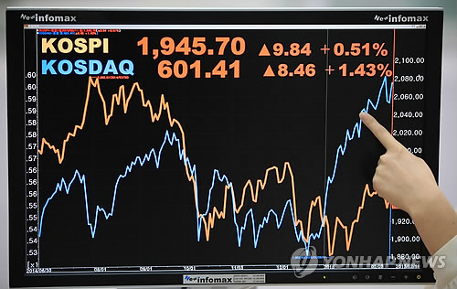 코스피는 전날보다 9.84포인트(0.51%) 상승한 1,945.70에, 코스닥지수는 8.46포인트(1.43%) 상승한 601.41에 각각 거래가 끝났다.