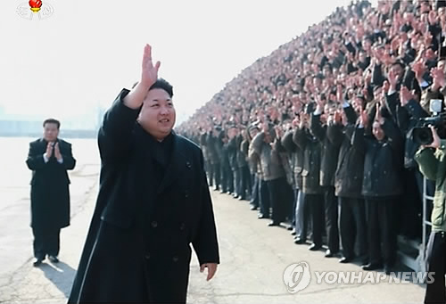 | △ 건설자들과 기념사진 찍고 격려한 북한 김정은 (서울=연합뉴스) 북한 김정은 국방위원회 제1위원장이 건설자들과 기념사진을 찍었다고 조선중앙TV가 12일 보도했다. 앞서 조선중앙통신은 이날 "김정은 동지께서 선군시대의 기념비적 창조물을 훌륭히 일떠세우는(건설하는)데서 노력적 위훈을 세운 8건설국 건설자들과 함께 기념사진을 찍으셨다"고 전했다. 사진은 촬영에 참여한 건설자들을 향해 손인사하는 김 제1위원장의 모습. 2015.2.12 nkphoto@yna.co.kr |