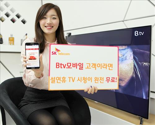 (서울=연합뉴스) 전성훈 기자 = SK텔레콤[017670]은 설 연휴 기간인 17∼23일 LTE 52요금제 이상을 쓰는 고객에 한해 'B tv 모바일'의 데이터 통화료를 부과하지 않는다고 12일 밝혔다.