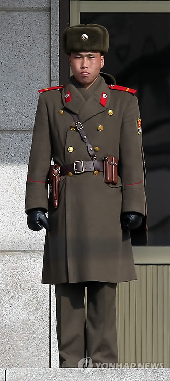 | △ 지난 4일 판문점 북측 지역인 판문각에서 한 �은 북한군 병사가 남측 지역을 주시하고 있다.<<연합뉴스DB>> |