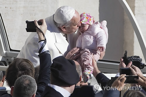 | △ 프란치스코 교황이 11일(현지시간) 바티칸 성 베드로 광장에서 열린 주례 미사에 도착해 한 아기에게 입을 맞춰주고 있다. (AP=연합뉴스) |