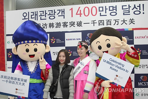 | △ 1천400만번째 외래관광객 맞은 청주공항 (청주=연합뉴스) 김형우 기자 = 29일 오후 청주공항이 1천400만번째 외래관광객을 맞은 가운데 한 중국인 관광객이 기념촬영을 하고 있다. 2014.12.29 vodcast@yna.co.kr |