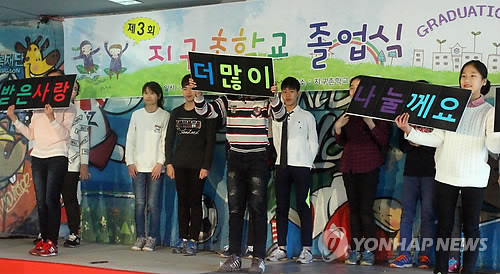| △ "받은 사랑 나눌게요" (서울=연합뉴스) 고현실 기자 = 일 서울 구로구 오류동 지구촌학교에서 열린 제3회 졸업식에서 졸업생들이 '받은 사랑을 나눠주겠다'는 내용의 무언극을 공연하고 있다. 사단법인 지구촌사랑나눔이 설립한 지구촌학교는 2011년 정규학교 인가를 받은 우리나라 최초의 다문화 대안초등학교이다. 2015.2.12 okko@yna.co.kr |