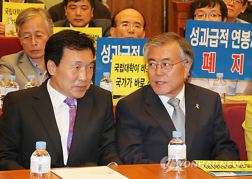 | △ 대화하는 문재인 의원과 손학규 고문 (서울=연합뉴스) 이상학 기자 = 문재인 새정치민주연합 의원(오른쪽)과 손학규 고문이 13일 오후 서울 여의도 국회헌정기념관에서 열린 '국립대 살리기 전국교수대회'에서 대화를 하고 있다.2014.6.13 leesh@yna.co.kr |