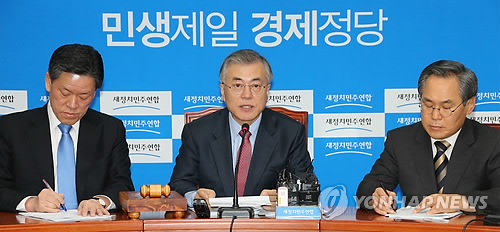 | △ 문재인 "이완구 공동여론조사 제안, 결과에 승복" (서울=연합뉴스) 백승렬 기자 = 새정치민주연합 문재인 대표가 13일 국회에서 열린 최고위원회의에서 이완구 총리 후보자 인준 문제와 관련, "만약 우리 주장(사퇴)을 야당의 정치공세로 여긴다면 중립적이고 공신력 있는 여론조사 기관에 여야 공동으로 여론조사를 의뢰하기를 청와대와 여당에 제안한다"며 "우리당은 그 결과에 승복할 용의가 있다"고 발언하고 있다. |
