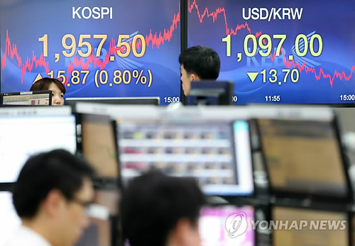 | △ 원·달러 환율 하락, 코스피 상승 (서울=연합뉴스) 박지호 기자 = 코스피는 13일 외국인의 1652억 순매수에 힘입어 15.87포인트(0.80%) 오른 1,957.50으로 장을 마쳤고, 서울외환시장에서 원·달러 환율은 전 거래일 종가보다 13.7원 내린 달러당 1,097원으로 거래를 마쳤다. 사진은 이날 오후 서울 중구 을지로 외환은행 본점 딜링룸의 모습. |