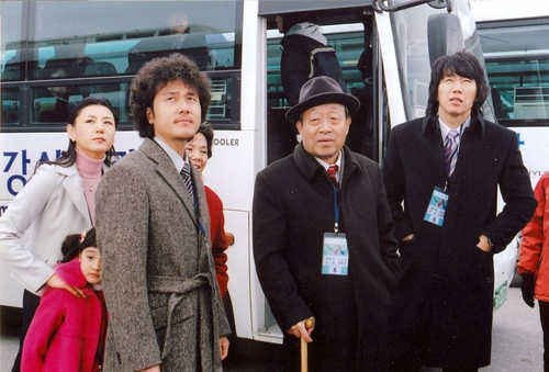 | △ 사진은 지난 2005년 국내 영화 중 분단 이후 최초로 북한에서 촬영된 '간큰가족'(제작 두사부필름, 감독 조명남)의 출연 배우들이 금강산에 도착해 촬영을 기다리는 모습이다. 오른쪽부터 배우 김수로, 신구, 감우성이다. <<연합뉴스DB>> |
