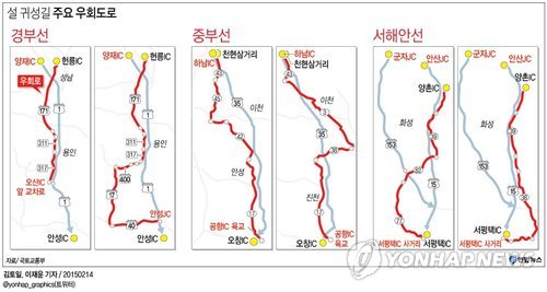 | △ <그래픽> 설 귀성길 주요 우회도로 (서울=연합뉴스) 장예진 기자 = 15일 국토교통부와 팅크웨어가 최근 2년간 명절 기간의 교통정보를 분석한 자료에 따르면 설 귀성길에 고속도로 정체가 심할 때 우회도로를 이용해 최대 46분을 단축할 수 있었던 것으로 나타났다. jin34@yna.co.kr 페이스북 tuney.kr/LeYN1 트위터 @yonhap_graphics |