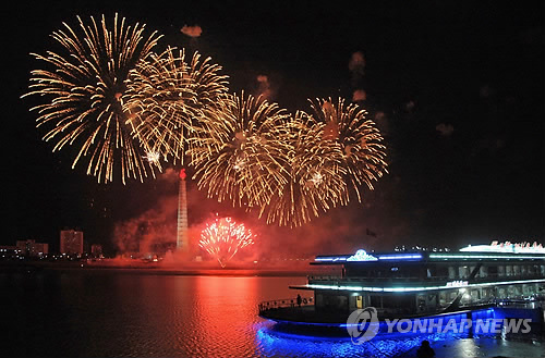 북한은 이날 새벽 0시를 기해 평양 대동강변 주체사상탑 일대에서 대규모 불꽃놀이 행사를 개최했다.