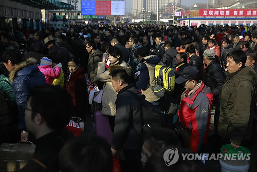 (베이징=연합뉴스) 이준삼 특파원 = 중국의 최대 명절인 춘제(春節·음력설)를 앞두고 지난 주말부터 시작된 중국인들의 '민족 대이동'이 16일 절정에 이를 것으로 보인다.